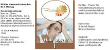 Für die direkte Unterstützung empfehlen wir Hair Power Spray Delphis Kosmetik Richter: direkt auf den Haarboden und in die Haare sprühen. Diese Flüssigkeit aktiviert sofort und nachhaltig alles rund um das Haar. Es lässt das Haar fülliger und glänzender aussehen, schützt das Haar und wirkt regenerierend.
